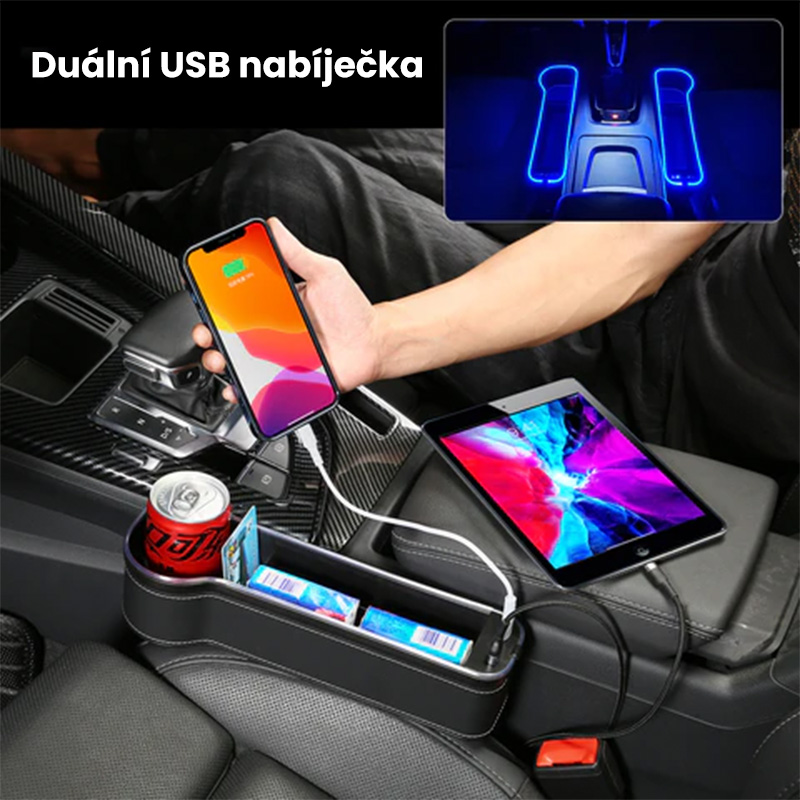 Naše revoluční řešení – organizér mezi sedadly, vám umožní mít během jízdy vše, co potřebujete na dosah ruky.